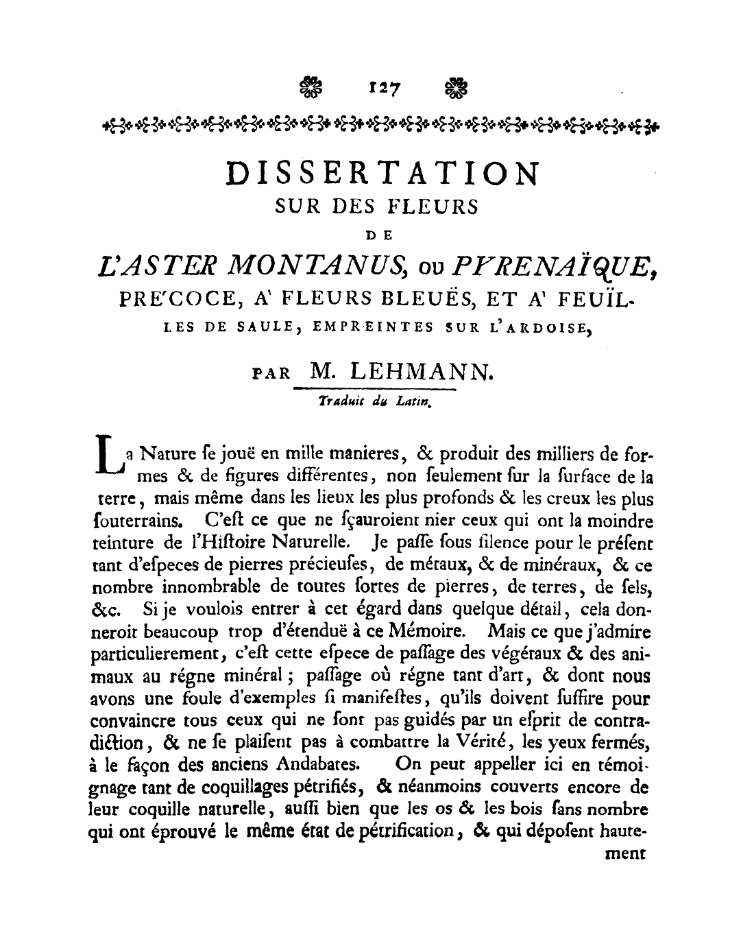 LEHMANN, Johann Gottlob: Dissertation sur des fleurs de l'aster montanus, ou pyrénaïque, précoce, à fleurs bleues, et à feuilles de saule, empreintes sur l'ardoise