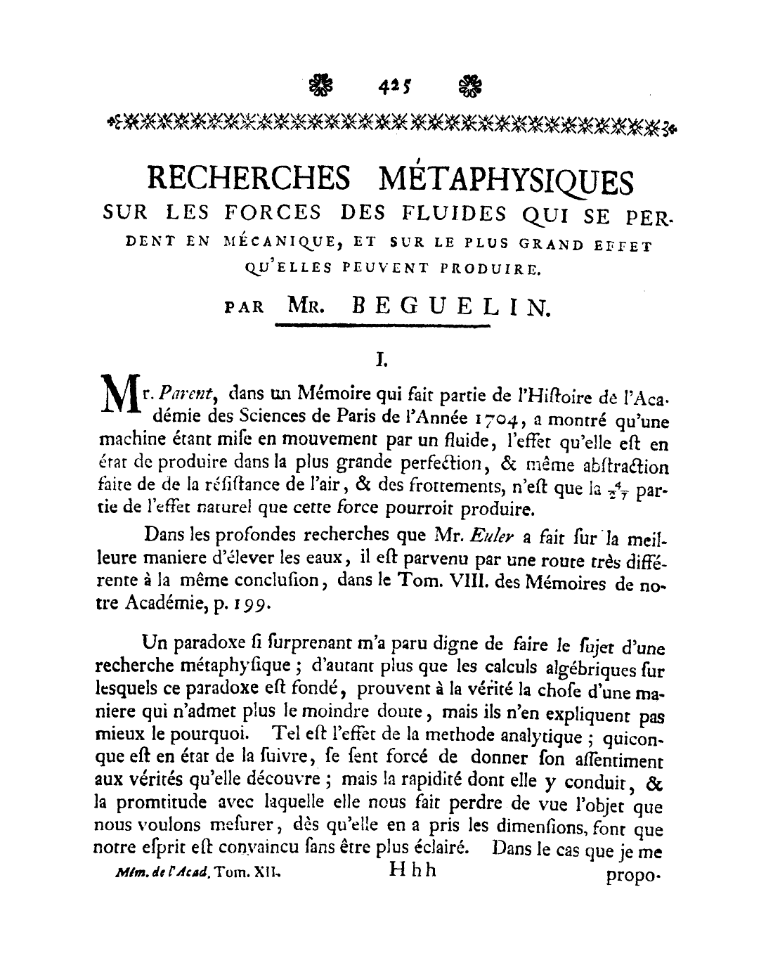 BEGUELIN, Nikolaus von: Recherches métaphysiques sur les forces des fluides qui se perdent en mécanique, et sur le plus grand effet qu'elles peuvent produire