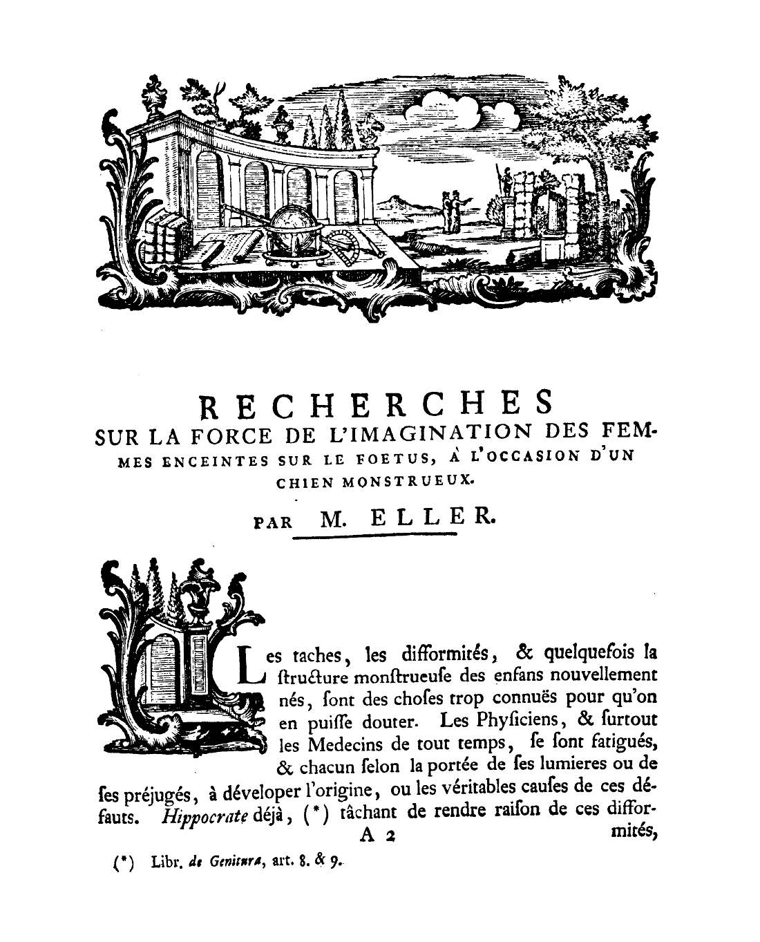 ELLER, Johann Theodor: Recherches sur la force de l'imagination des femmes enceintes sur le foetus, à l'occasion d'un chien monstrueux